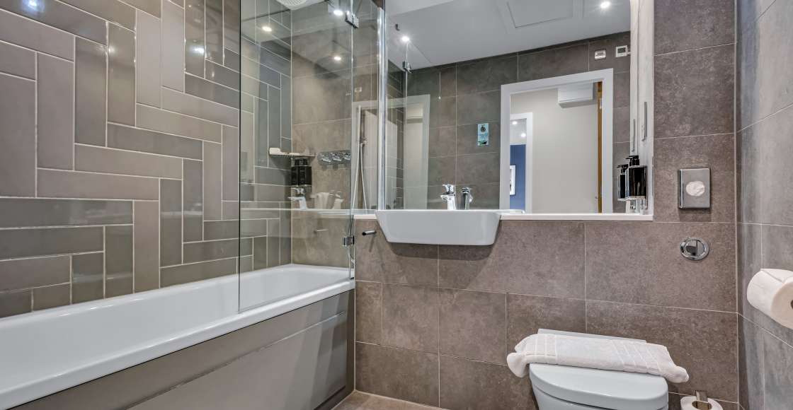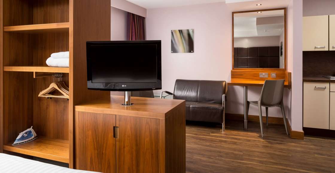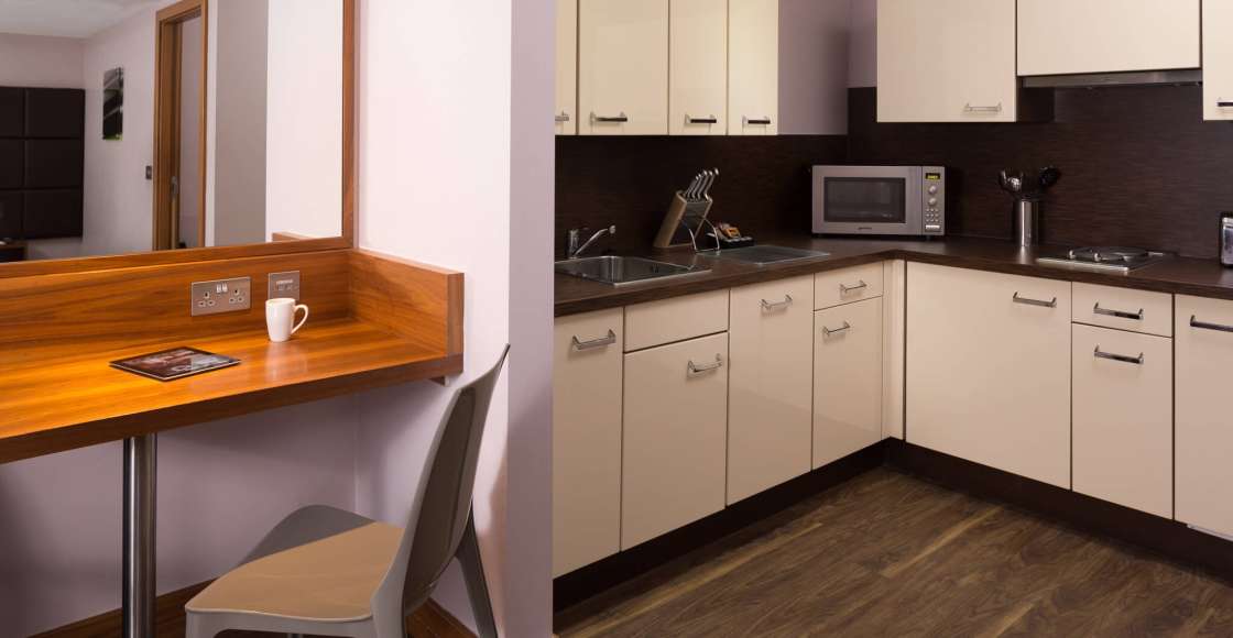 Our fully equipped kitchens come with a kettle, toaster, microwave, fridge (with freezer compartment), dishwasher, 2 ring hob and extractor hood. Inside the cupboards you’ll find crockery and cutlery, tumblers, wine glasses, knife set, pans, colander, frying pan and a chopping board. Everything you need to cook up a storm in your own apartment.