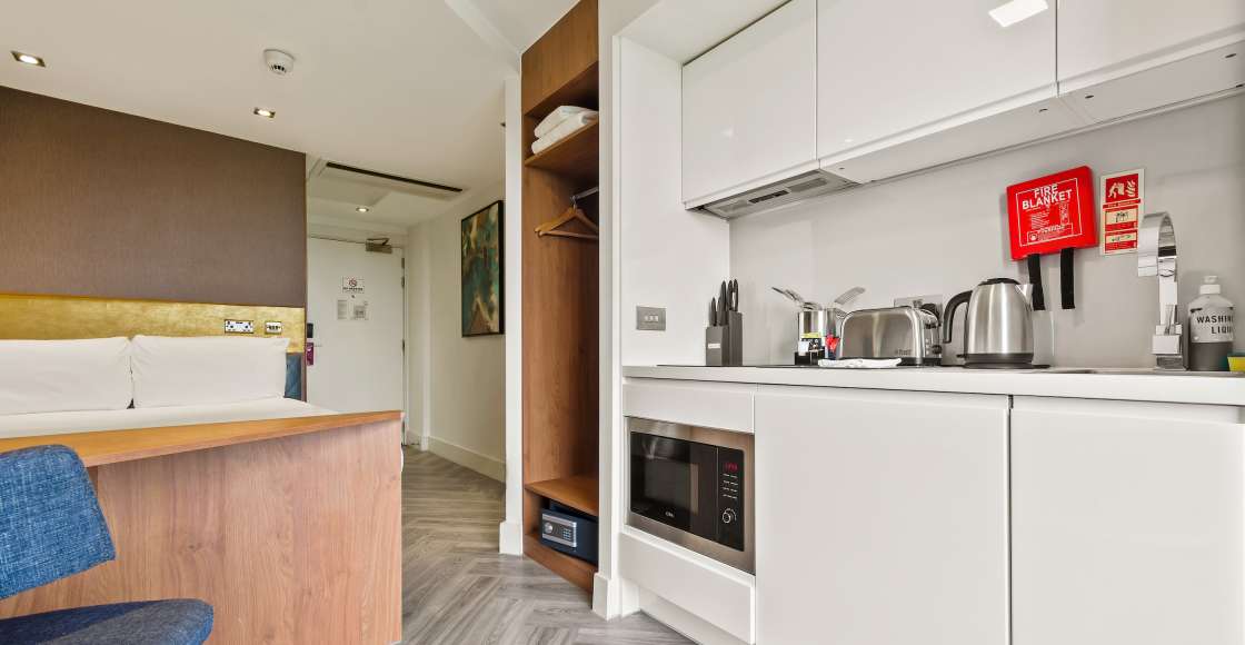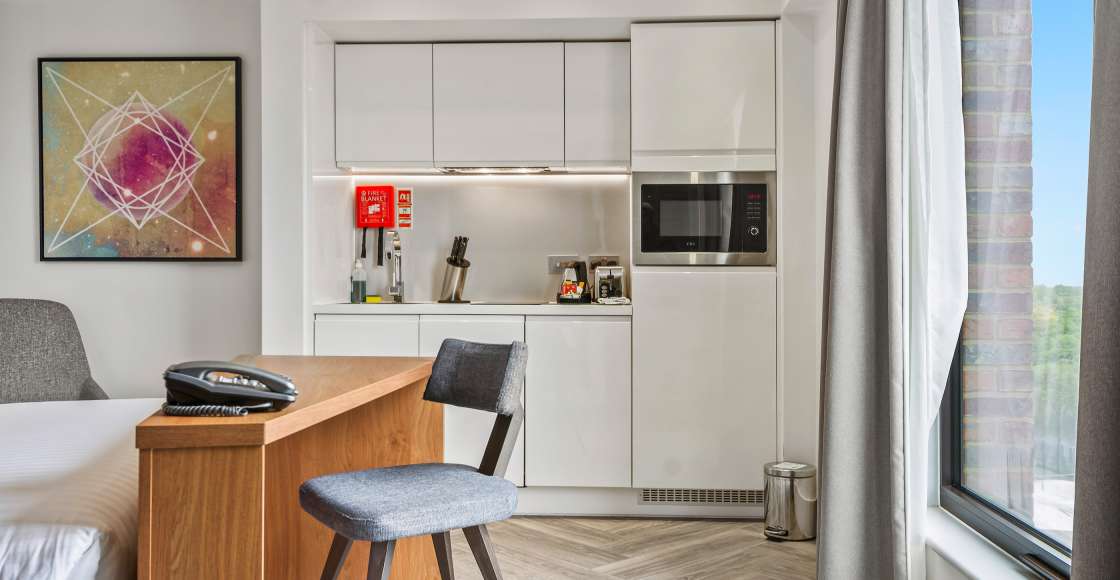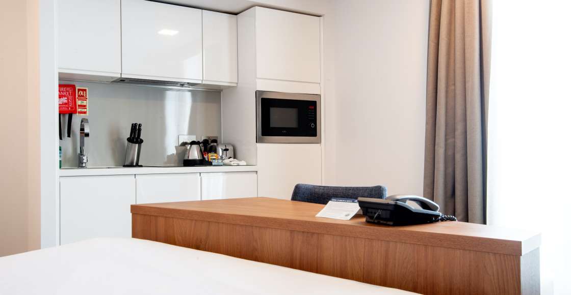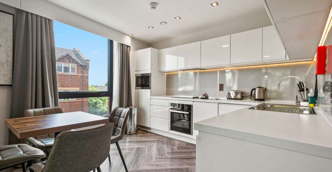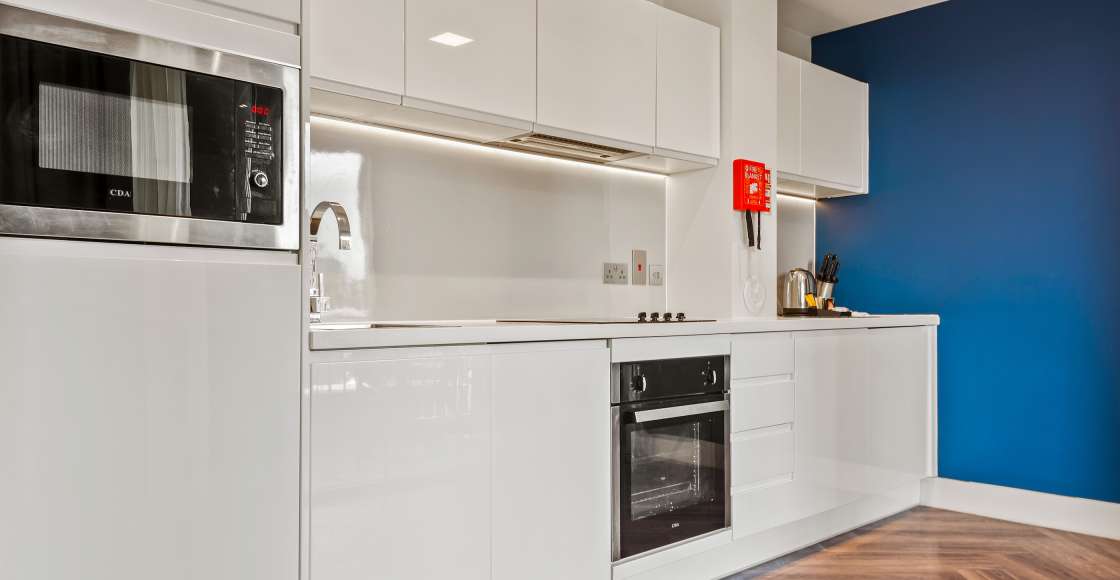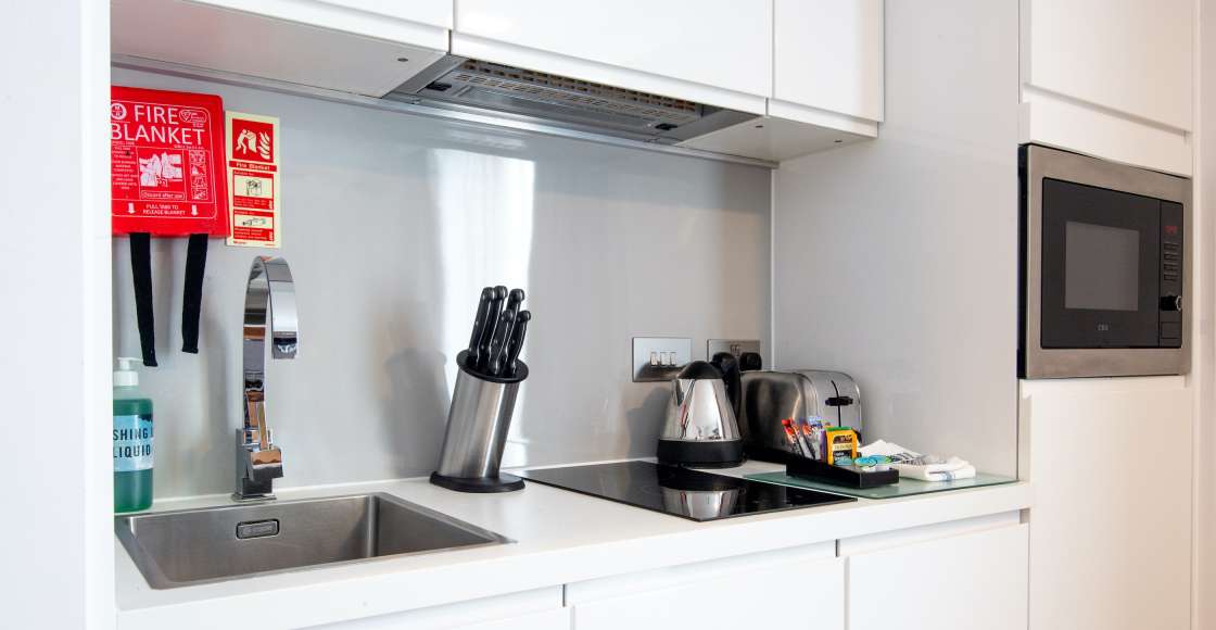 Our fully equipped kitchens come with a kettle, toaster, microwave, fridge (with freezer compartment), dishwasher, 2 ring hob and extractor hood. Liberty Suites also have an oven. Inside the cupboards you’ll find crockery and cutlery, tumblers, wine glasses, knife set, pans, colander, frying pan and a chopping board. Everything you need to cook up a storm in your own apartment.