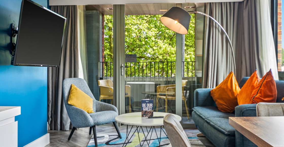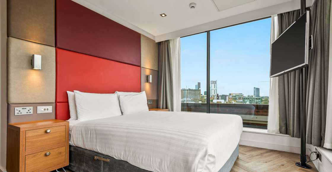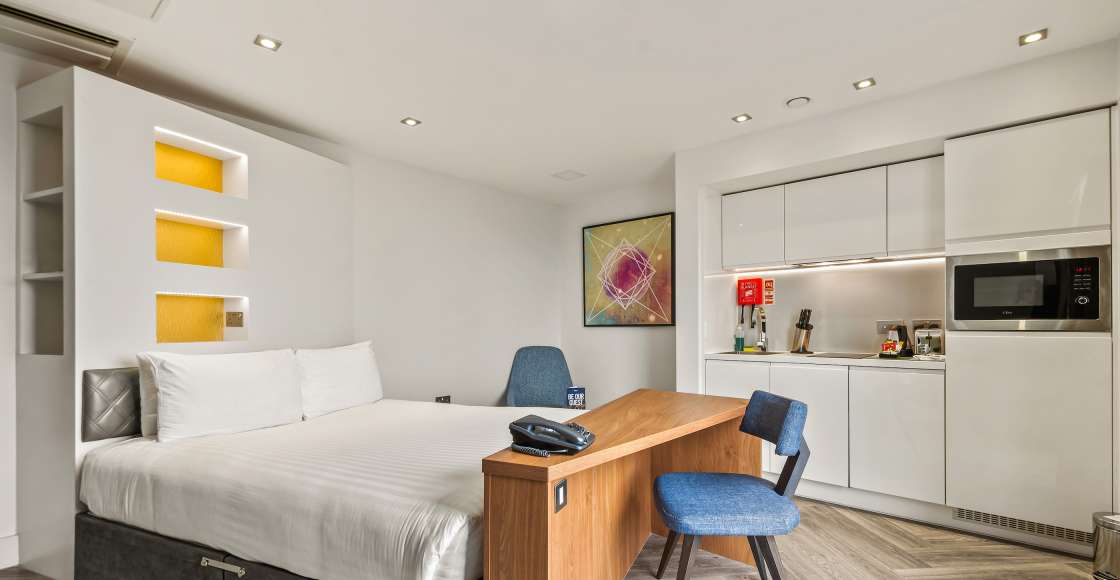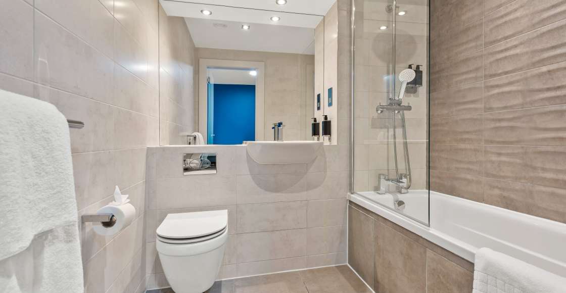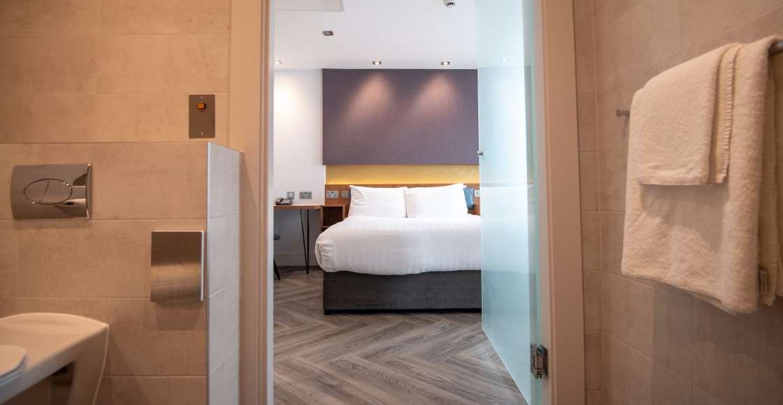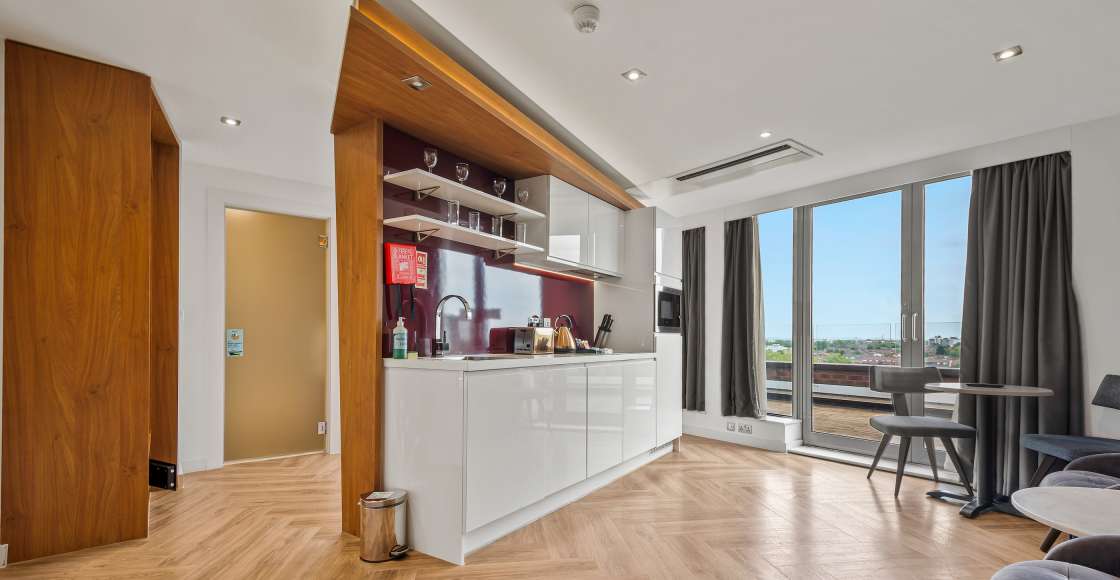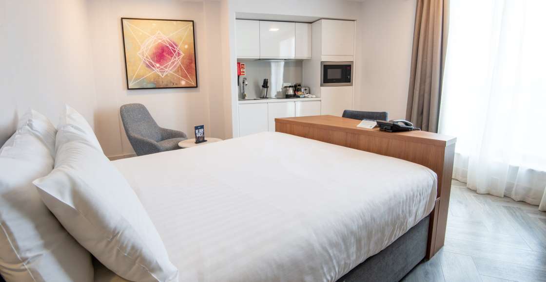 Our fully equipped kitchens come with a kettle, toaster, microwave, fridge (with freezer compartment), dishwasher, 2 ring hob and extractor hood. Liberty Suites also have an oven. Inside the cupboards you’ll find crockery and cutlery, tumblers, wine glasses, knife set, pans, colander, frying pan and a chopping board. Everything you need to cook up a storm in your own apartment.