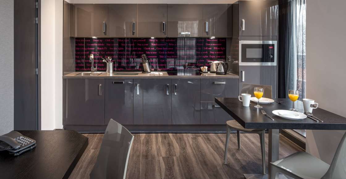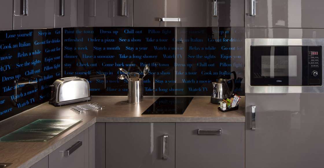 Our fully equipped kitchens come with a kettle, toaster, microwave, fridge (with freezer compartment), dishwasher, 2 ring hob and extractor hood. Inside the cupboards you’ll find crockery and cutlery, tumblers, wine glasses, knife set, pans, colander, frying pan and a chopping board. Everything you need to cook up a storm in your own apartment.