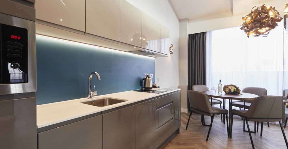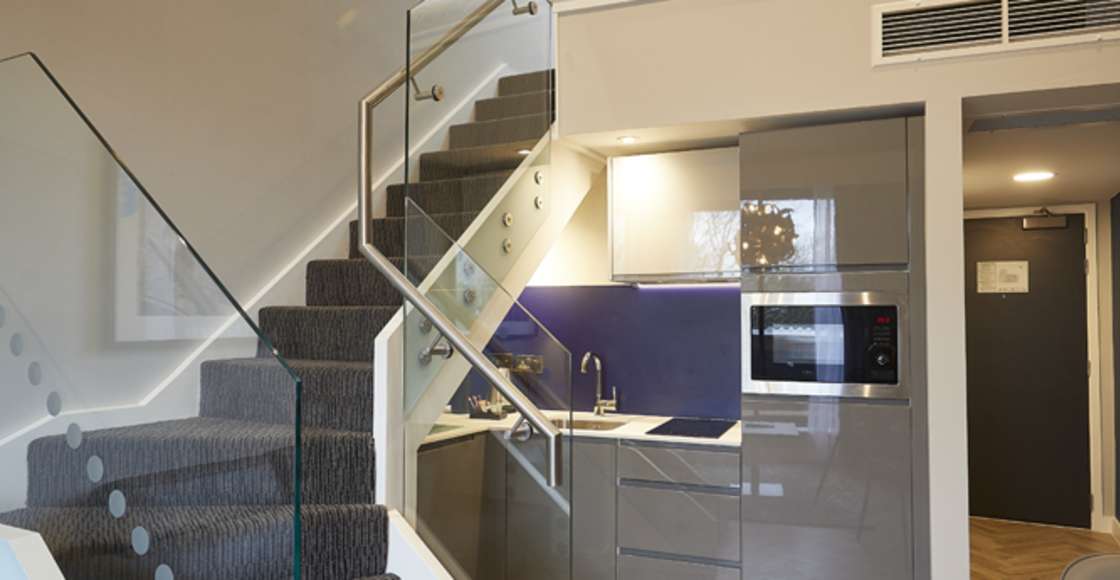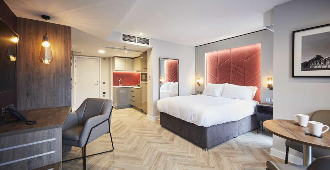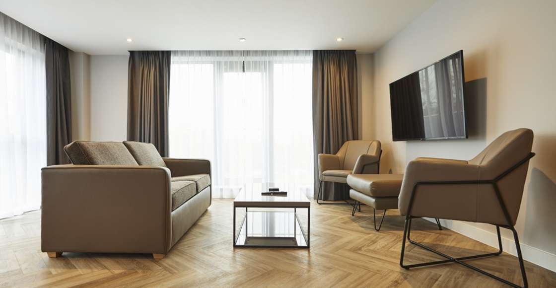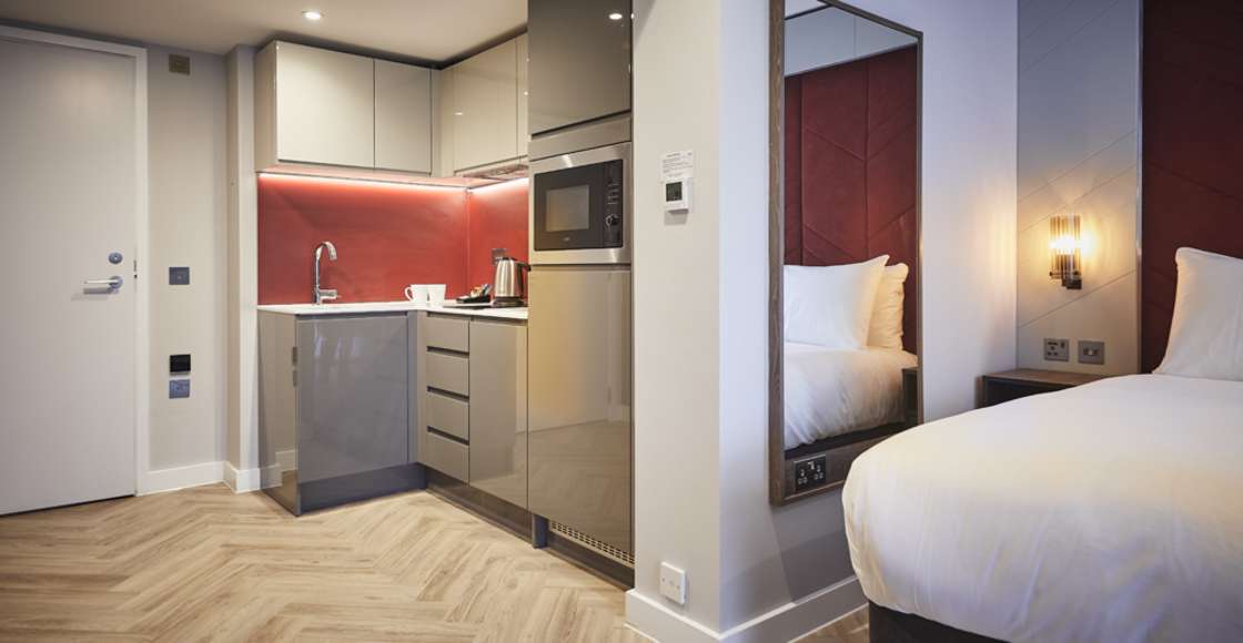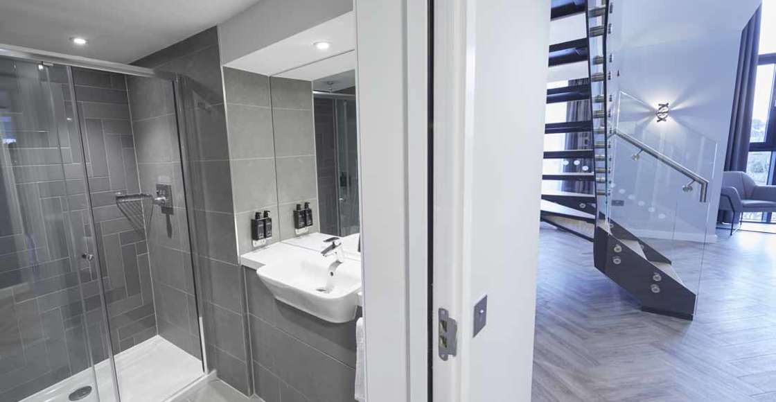 Our fully equipped kitchens come with a kettle, toaster, microwave, fridge (with freezer compartment), dishwasher, 2 ring hob and extractor hood. Inside the cupboards you’ll find crockery and cutlery, tumblers, wine glasses, knife set, pans, colander, frying pan and a chopping board. Everything you need to cook up a storm in your own apartment.