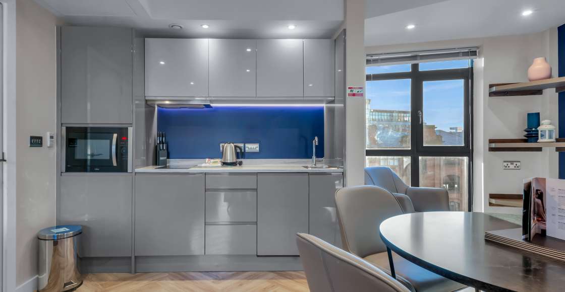 Our fully equipped kitchens come with a kettle, toaster, microwave, fridge (with freezer compartment), dishwasher, 2 ring hob and extractor hood. Inside the cupboards you’ll find crockery and cutlery, tumblers, wine glasses, knife set, pans, colander, frying pan and a chopping board. Everything you need to cook up a storm in your own apartment.