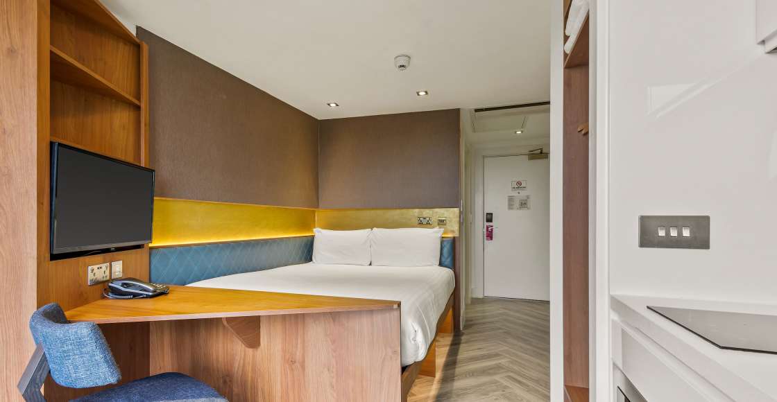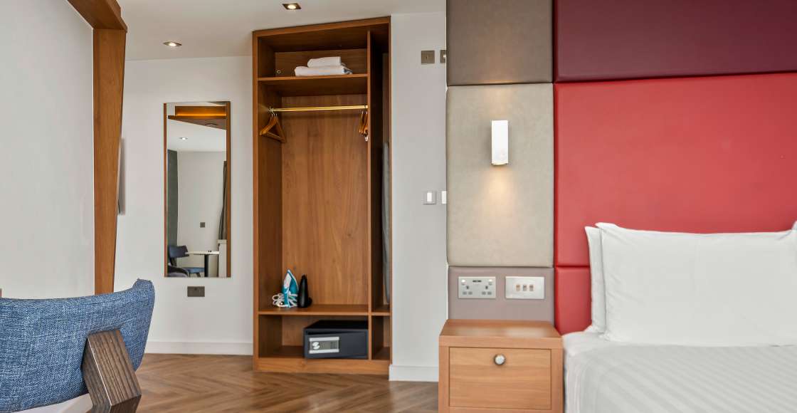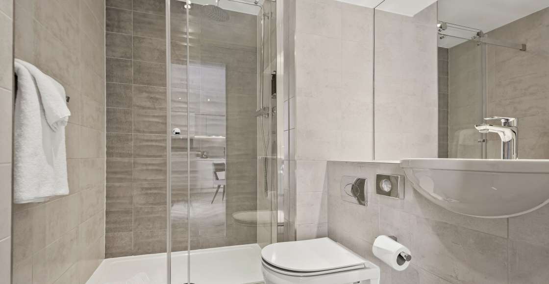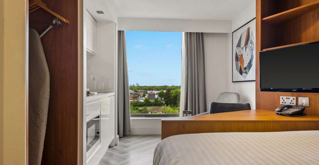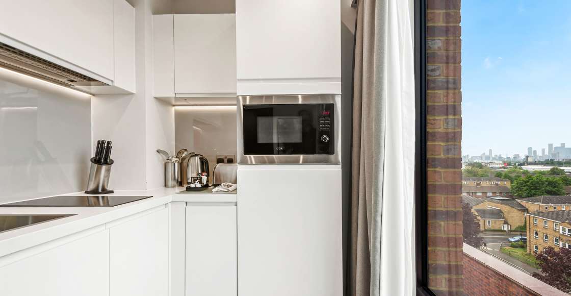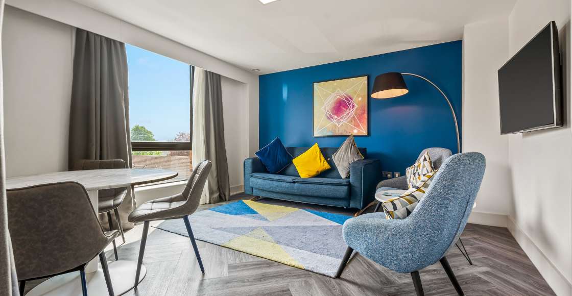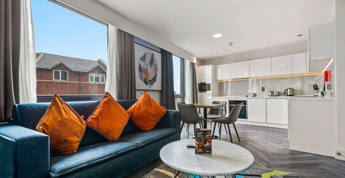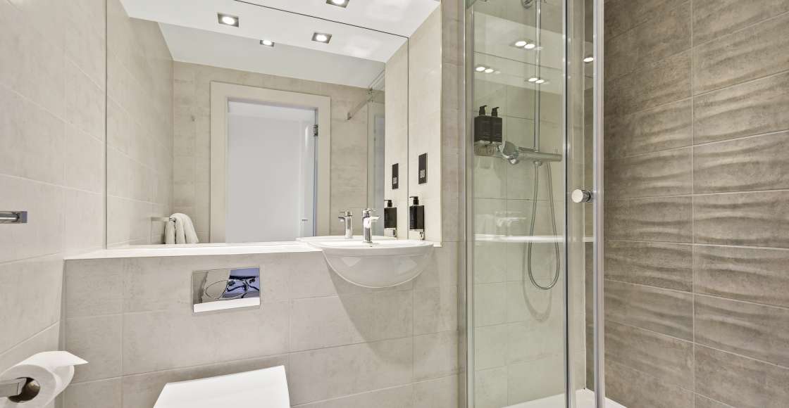 Our fully equipped kitchens come with a kettle, toaster, microwave, fridge (with freezer compartment), dishwasher, 2 ring hob and extractor hood. Liberty Suites also have an oven. Inside the cupboards you’ll find crockery and cutlery, tumblers, wine glasses, knife set, pans, colander, frying pan and a chopping board. Everything you need to cook up a storm in your own apartment.