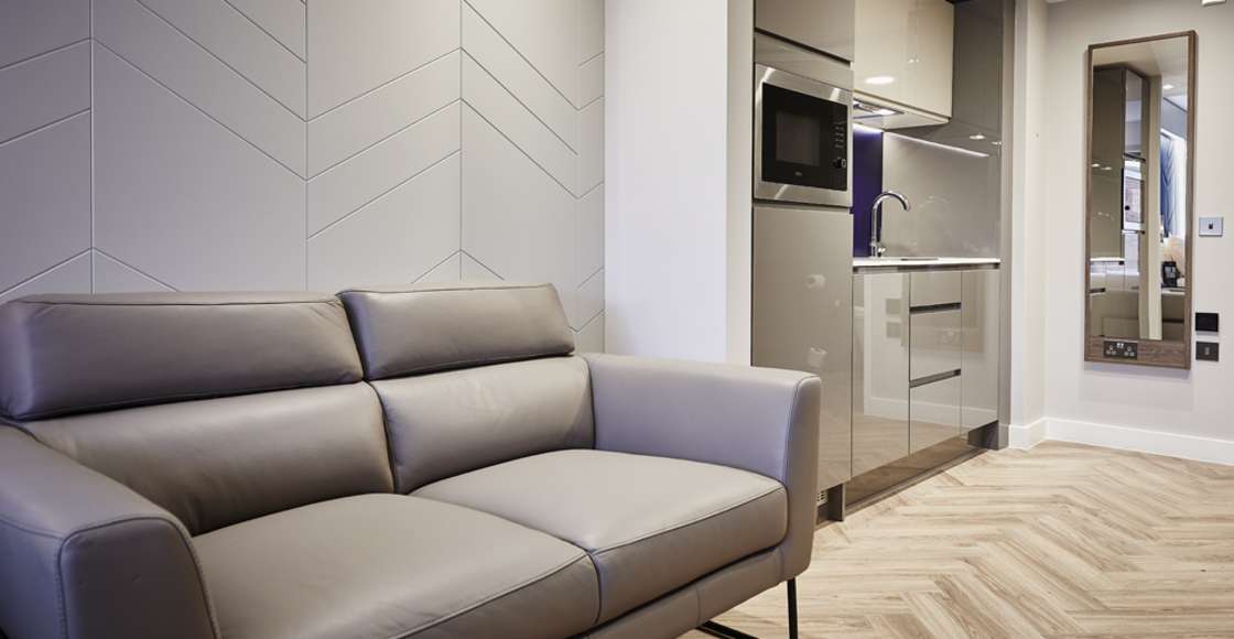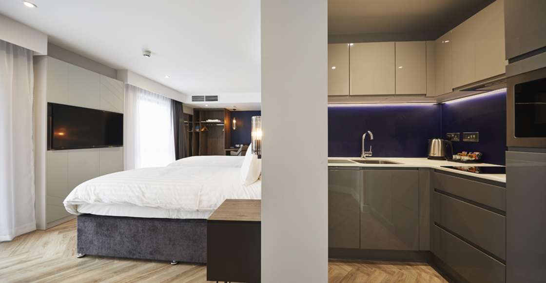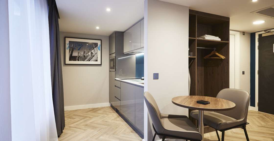 Our fully equipped kitchens come with a kettle, toaster, microwave, fridge (with freezer compartment), dishwasher, 2 ring hob and extractor hood. Inside the cupboards you’ll find crockery and cutlery, tumblers, wine glasses, knife set, pans, colander, frying pan and a chopping board. Everything you need to cook up a storm in your own apartment.
